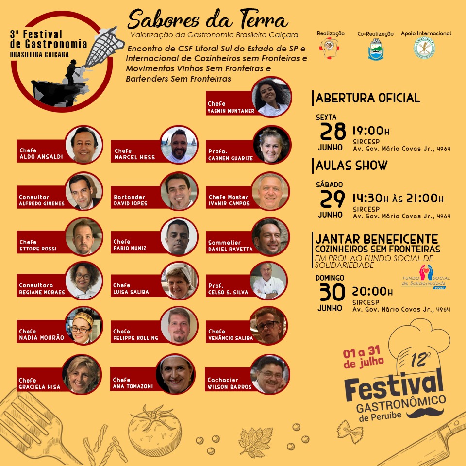 Peruíbe, cidade turística do litoral paulista recebeu o 3º Festival de Gastronomia Brasileira Caiçara. O evento contou com a presença do projeto Cozinheiros Sem Fronteiras da AREGALA (Associação de Restauradores Gastronômicos das Américas e do Mundo), com aulas show e um jantar beneficente com pratos especiais feitos pelo chefe anfitrião e equipe do evento.