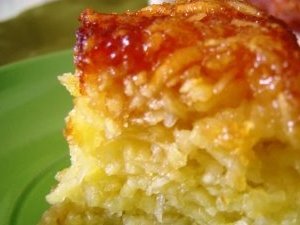Coloque em forma retangular + ou – 37X25 cm, untada com manteiga, e leve ao forno por 40 minutos ou até dourar. Forno a 180oC. Depois de assado coloque em cima a calda quente.