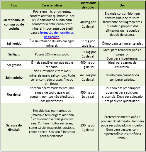 O quadro a seguir indica os diferentes tipos de sal, quais as suas características, e quanto de sódio fornecem e como são usados: