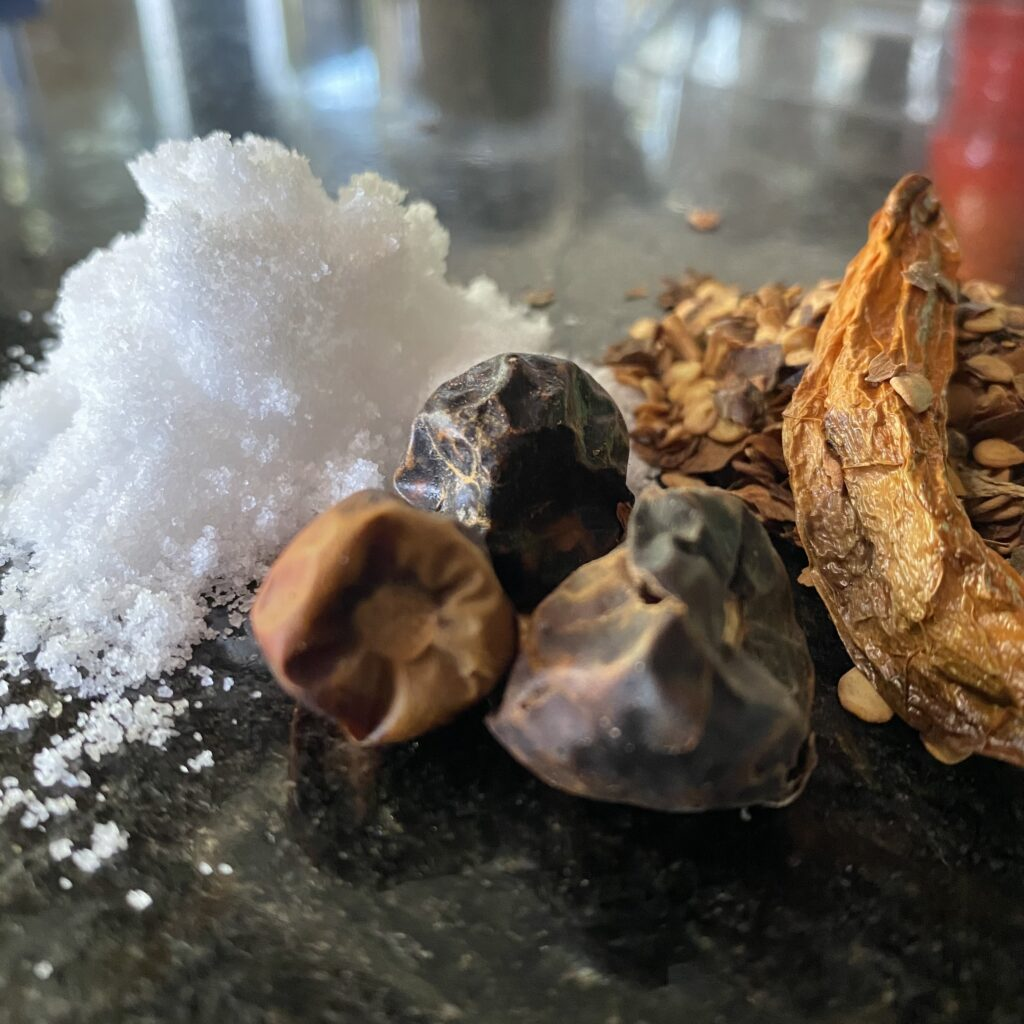 6- Para o sal oriental: bata no liquidificador gengibre seca, pimenta seca, aipo em pó, sementes de coentro, rapas de limão seco, sementes de mostarda.
