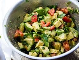 Cortar a cebola em cubinhos bem pequenos e colocar de molho em água gelada, durante 5 minutos, para tirar um pouco da acidez. Cortar o tomate ao meio, tirar sementes e cortar cubinhos bem pequenos. Reservar. Picar o coentro ou a salsa fresca. Amassar o abacate com um garfo, acrescentar o suco do limão, a cebola após os 5 minutos , o tomate picado, o coentro picado, a pimenta e o sal.