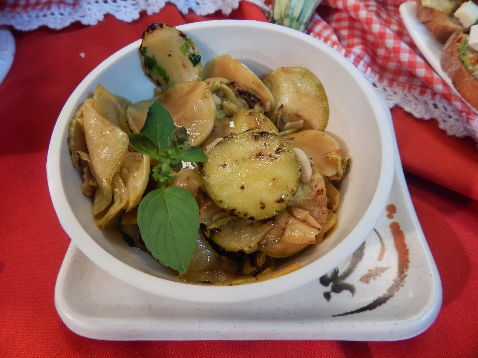 Ingredientes: 1 xícara (chá) de azeite de oliva ½ xícara (chá) de vinagre de vinho branco – 4 abobrinhas grandes – 5 dentes de alho picados – 1 pimenta-dedo-de-moça, sem sementes, bem picada – Sal, noz moscada e pimenta-do-reino a gosto. Se gostar: orégano e ervas picadinha.