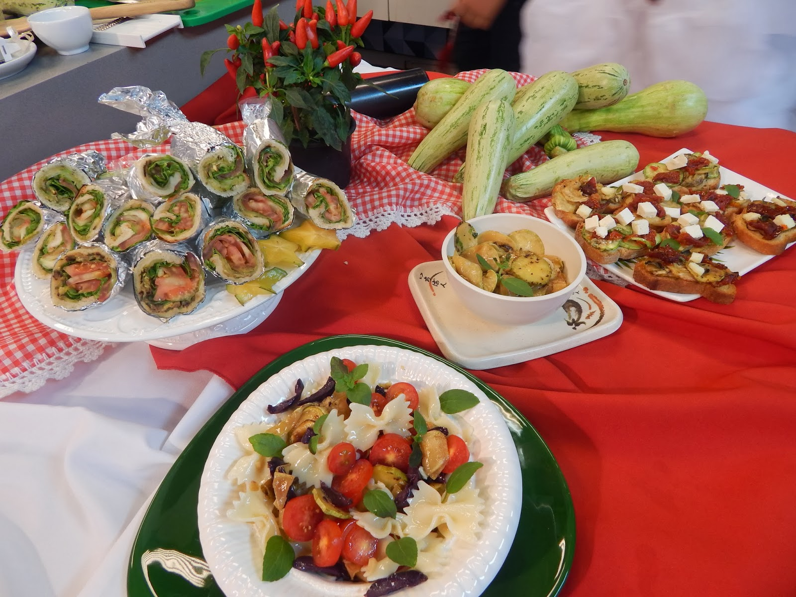 Ingredientes: 300g de macarrão cozido – abobrinhas marinadas – Azeitonas e tomate cereja. Sirva quente ou frio. Decore com folhas de manjericão.
