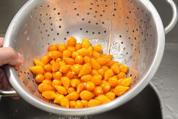 Jogue fora as pimentas deterioradas na primeira curtida. Com os melhores frutos em mãos, lave-os bem em água corrente.