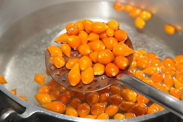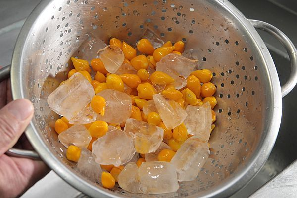 Retire-as com escumadeira e ponha num balde com gelo. O choque térmico mantém as pimentas firmes e com a cor intensa.