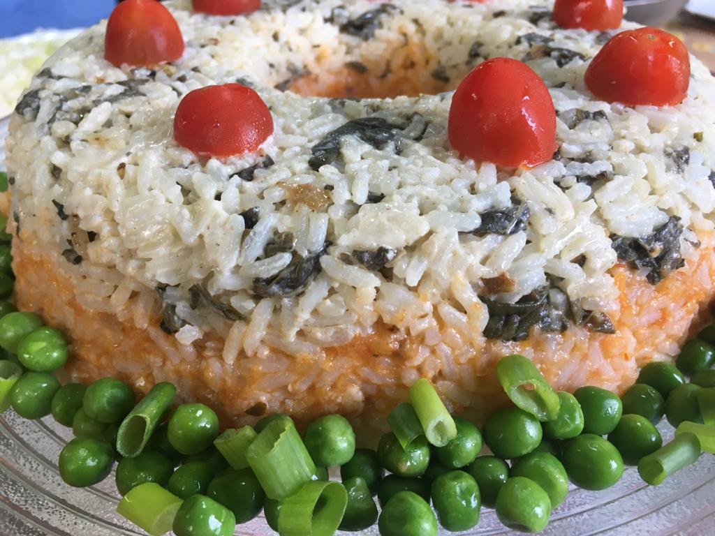 Monte cada camada em forma de anel, untada com azeite. Apertando bem na ultima camada e vire em prato onde ira servir. Sirva quente: decorada com ervilhas frescas, tomatinhos cereja e ervinhas frescas! Fica lindo!
