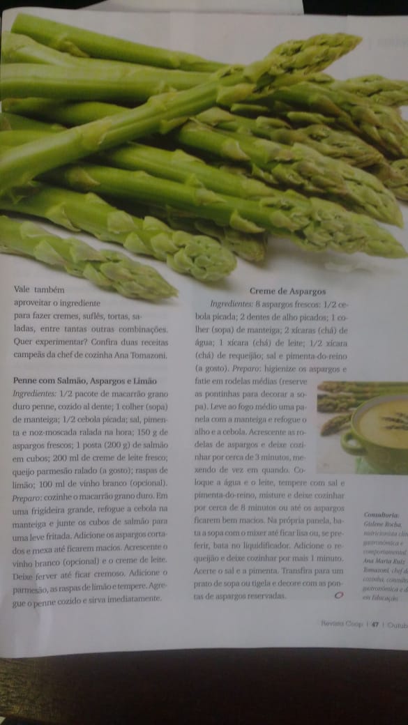 Num trabalho conjunto, com nossa parceira de aulas e muitas conexões a nutricionista. Gislene Rocha. Preparamos uma matéria para Revista Coop, Outubro / 19, com o tema “Aspargos no prato’ com seu olhar nutricional e gastronômico, confira fotos receitas e muito mais.