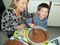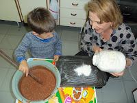 Lorenzo de 2 anos e meio gosta de ajudar na cozinha, imagine na preparação do bolo de chocolate, ele quis caprichar até na cobertura colorida.