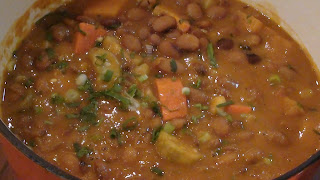 Utilize o método prático de hidratar os grãos, escolha o feijão retirando as sujidades lave o feijão deixe-o de molho em água fervente por 30 minutos (fogo desligado), panela tampada, depois ligue o fogo e cozinhe por 10 a 15 minutos. Espere 30 minutos para abrir a panela. Obs. Cozinhe o feijão, na água em que ficou de molho, até começar a desmanchar. Em uma panela grossa coloque o azeite e o alho, deixe dourar junte a cebola até ficar transparente, se quiser junte outros temperos (amarrado de ervas, tomates, pimentões etc). Coloque todos os legumes, junte o feijão cozido, se necessário água fervente. Deixe ferver e engrossar (dê algumas amassadas com a concha em alguns grãos).