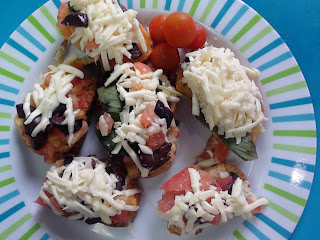 – Em uma frigideira anteaderente coloque as fatias de pães italiano e cubra com tampa, deixe começar a dourar, vire só então coloque a rodela de tomate temperado, o queijo curado e quiser pedacinhos de feta. Folhinhas de manjericão.