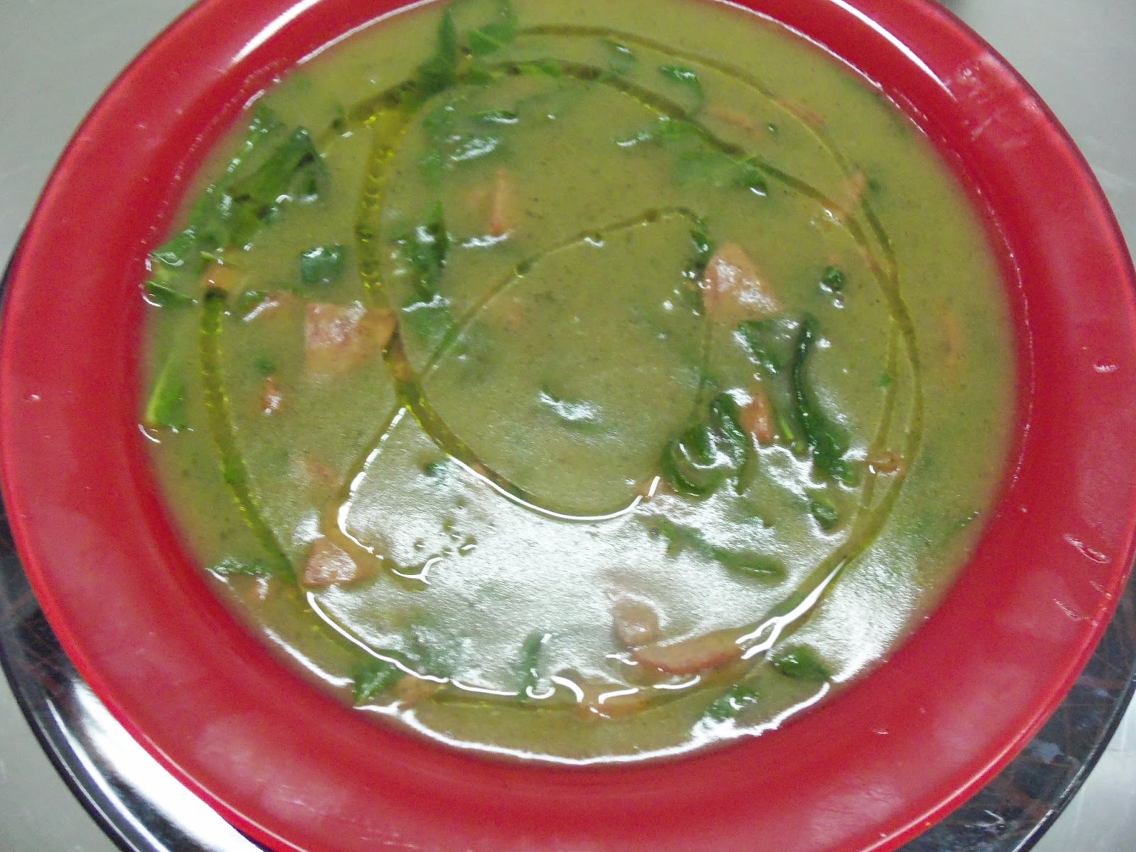 Modo de Preparo: Lave a couve, enxugue e corte bem fininha. Aqueça o,azeite numa panela grande e faça um refogado da cebola alho até ficarem transparentes, acrescente as batatas e deixe alourar. Coloque água até que todos os ingredientes estejam cobertos. Deixe cozinhar até que as batatas estejam macias. Tire a panela do fogo e bata a mistura no liquidificador ou mix. Corte a lingüiça em rodelas e grelhe até dourar, retirar a gordura. Leve a panela de volta ao fogo, acrescente a lingüiça e o caldo e aqueça lentamente. Ajuste os temperos. Se necessário, ajuste a consistência com mais água. Adicione a couve, acrescente um fio de azeite. Sirva com broa de milho.
