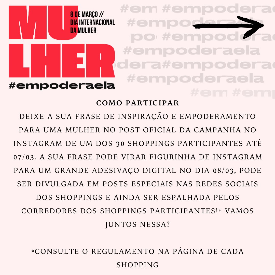 A ação convida os clientes do shopping a criarem frases inspiradoras e de empoderamento feminino. Assim os clientes do shopping são convidados a criarem frases inspiradoras e de empoderamento feminino e, usando a hashtag #EmpoderaEla, postá-las (entre os dias 18/2 e 7/3) nos comentários das publicações oficiais dos perfis do shopping no Instagram e no Facebook.