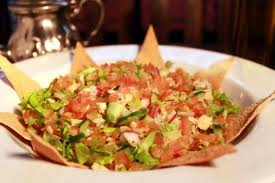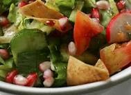 Ingredientes: 1 pé de alface pequeno (melhor americana)– 2 pepinos cortados em rodelas – 3 tomates cortados em cubos- 4 rabanetes em fatias- 1 cebola média picada em pétalas. 1 cenoura grande em finas fatias. Pão sírio, picado em triângulos torrado,