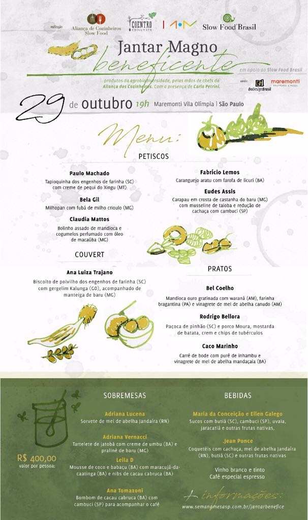 No dia 29 de outubro, o Convívio Slow Food Grande ABC-SP marcou presença no cardápio, com sua Chef de Cozinha Ana Maria Tomazoni, no Jantar Magno Beneficente em apoio ao Slow Food Brasil, com produtos da comunidade do Cambuci, uma das guardiãs da sociobiodiversidade brasileira.