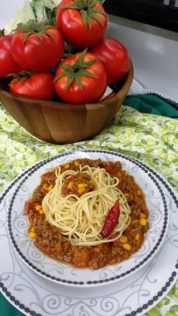 Modo de Preparo:1. Numa panela grande esquente o azeite em fogo forte, junte o alho e deixe dourar. Acrescente a carne e refogue bem, só então junte a cebola, o milho verde, os pimentões mexendo sempre.2. Adicione os tomates, o catchup, o caldo de carne, os temperos, o chili e o sal deixe levantar fervura. Diminua bem o fogo, tampe e cozinhe por 15 minutos. Se for preciso adicione mais água quente.3. Sirva com o macarrão cozido Prepare conforme instruções do fabricante (do pacote).