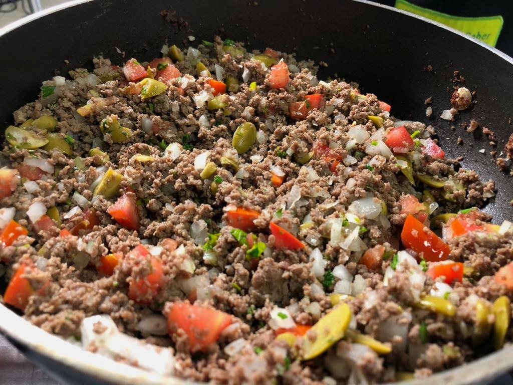 2. Leve ao fogo a carne e frite na própria gordura; junte a cebola, alho, tomate, a pimenta e cominho, continuando a fritar por mais alguns minutos.