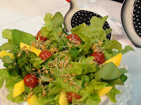 Sugestão para salada: folhas de alface americana, folhas de rúcula, folhas de alface crespa, 1 manga em fatias, tomate cereja, brotos de trigo grão germinados e cubinho de pão de forma torrado.