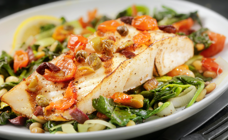 2- Em um refratário coloque um fio de azeite de oliva extra virgem, coloque a metade do pimentão picado e a metade da cebola. Depois o peixe, as alcaparras e novamente o pimentão, cebola, palmito e o tomate. Regue azeite de oliva e salpique um pouco de salsa.