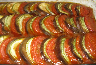 Coloque em um refratário uma camada de molho de tomate. Monte, alternadamente, rodelas de tomate, berinjela e abobrinha. Tempere com sal e pimenta. Regue com azeite. Cubra com papel manteiga no tamanho do refratário, formando uma tampa. Leve ao forno 200°C por aproximadamente 40 minutos ou até os legumes ficarem macios. Servir quente ou frio.