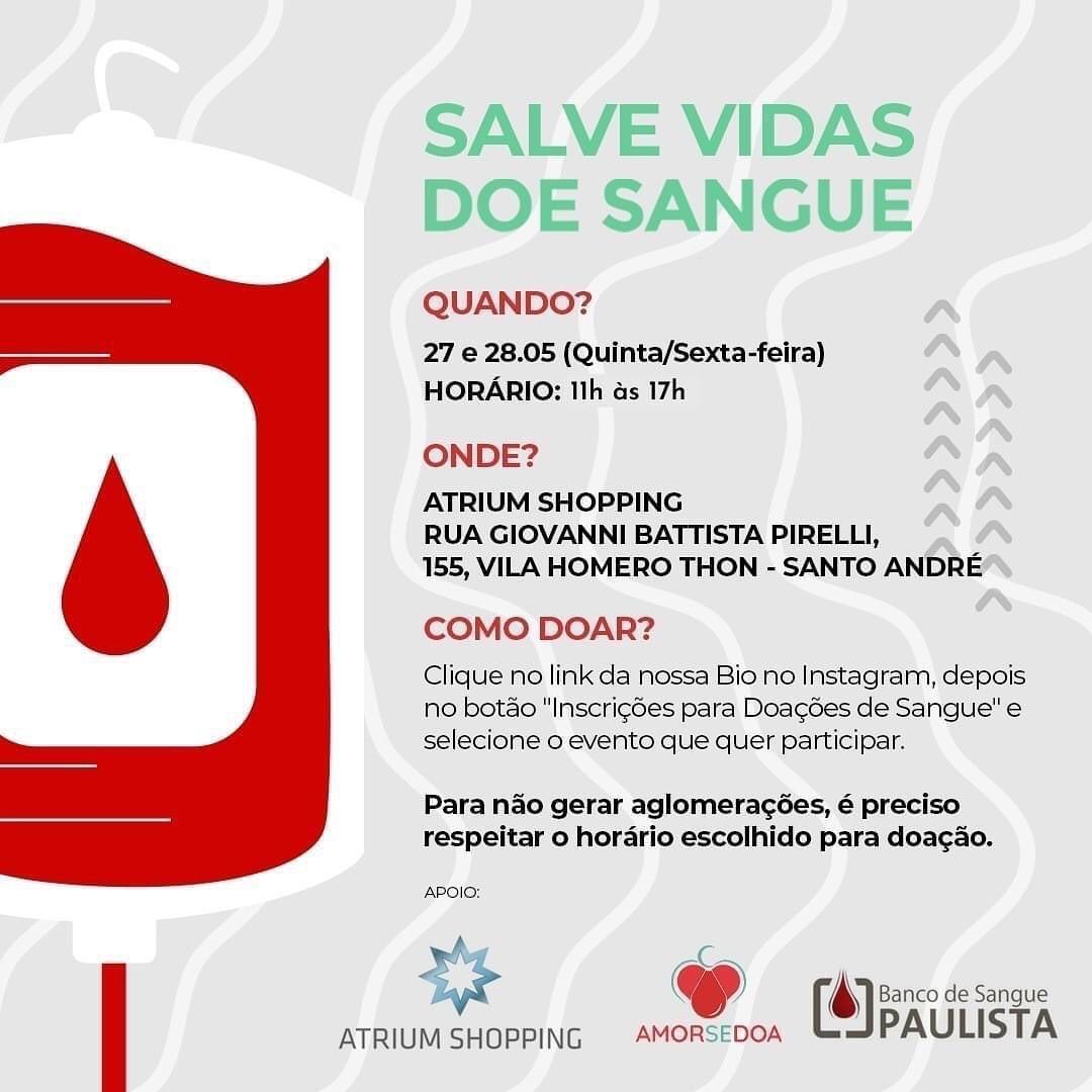 O estoque de bolsas de sangue atualmente está em alerta, segundo a Fundação Pró-Sangue. Com o momento delicado que o País atravessa por causa da pandemia do Covid-19, é possível que a situação se agrave. O Atrium Shopping, em parceria com o “Projeto Amorsedoa”, abre espaço para seus visitantes participarem da campanha e doarem nos dias 27 e 28 de maio.