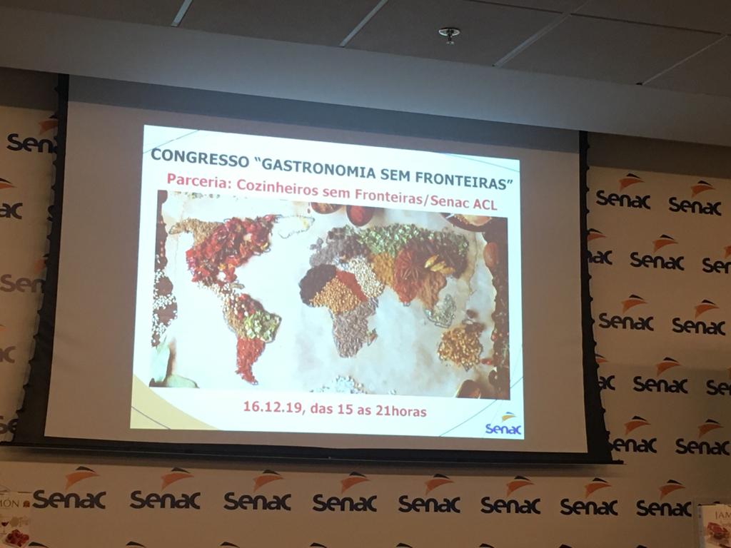 No Senac- Aclimação, na segunda-feira, 16 de dezembro aconteceu em São Paulo das 15h às 21h o Congresso Gastronomia sem Fronteiras, em parceria, e iniciativa da Cozinheiros sem Fronteiras e Aregala Internacional, o evento que reuniu mais de 100 profissionais da gastronomia nacional e internacional para atualização dos conceitos e tendências no universo da gastronomia.