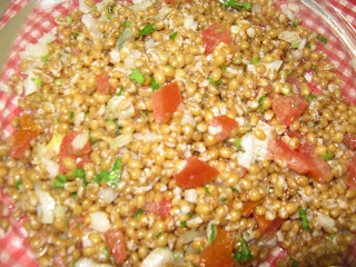 Ingredientes: 200g de trigo grão – 2 tomates maduros – ½ cebola picada – 2 dentes de alho – ½ xícara (chá) de hortelã picada – suco de 1 limão – 6 colheres (sopa) de azeite de oliva – 1 colher (sobremesa) de gengibre ralado – opcional: frutas secas picadas (uva passa, ameixa, damasco).