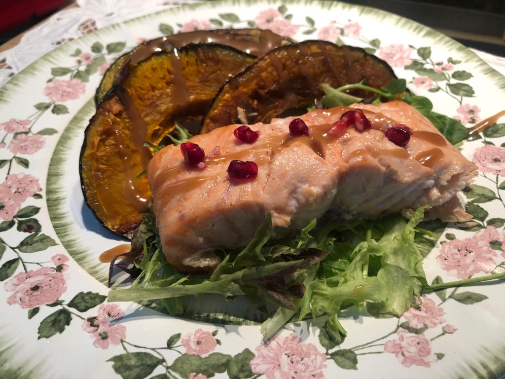 3. Monte o prato com salmão assado, abobora regado ao molho especial (mel, mostarda e tahine)