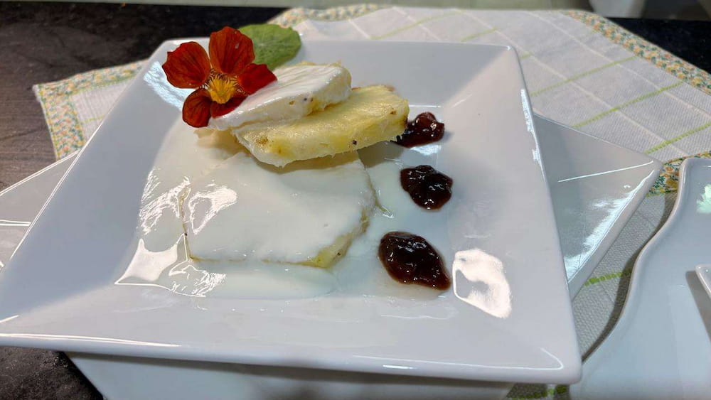 Abacaxi fresco com creme de iogurte e coco + coulis de frutas vermelhas