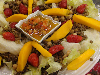 9- Montagem: Organize as folhas verdes no fundo do prato, coloque a lentilha e o grão de bico, e decore com o morango e a manga.