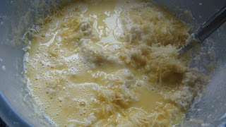 Coloque o queijo e os ovos batidos, misture bem e despeje a metade da massa em uma forma (aro 20cm) untada com manteiga e farinha de trigo.
